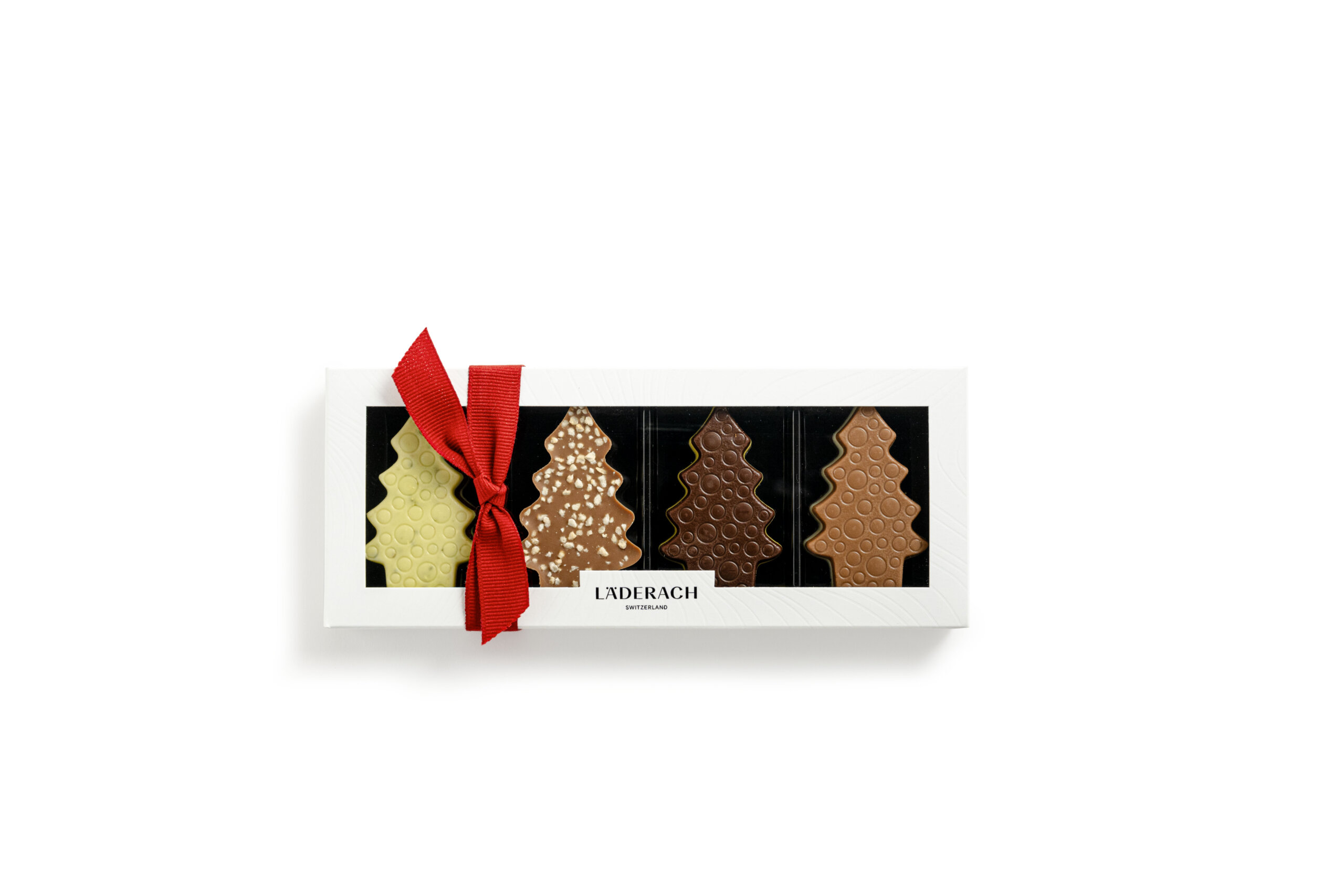 Four layered christmas trees of gianduja in three recipes: 1x pistachio, 2x almond and 1x orange dark