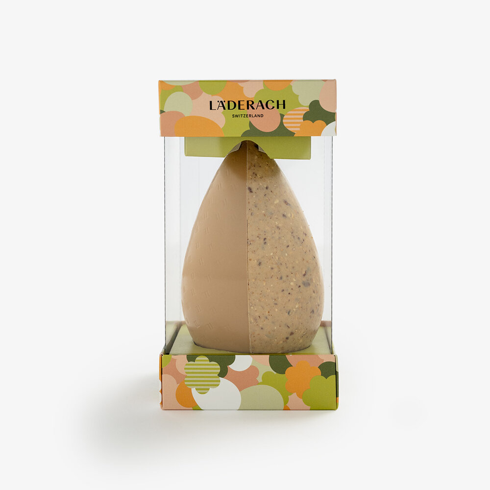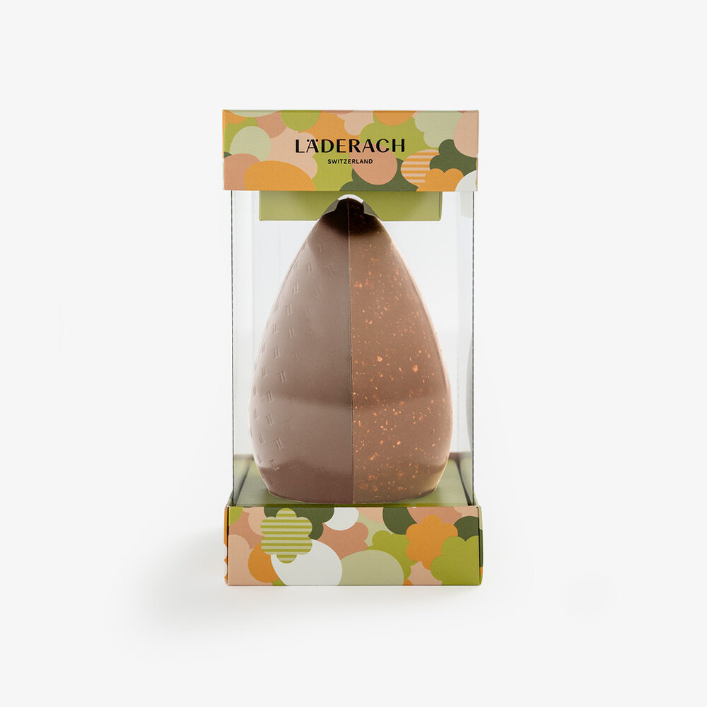 Oeuf de Pâques composé de deux moitiés : l'une en chocolat au lait et l'autre en pâte d'amandes pralinées blanches ultra-fine avec des amandes grossièrement moulues caramélisées.